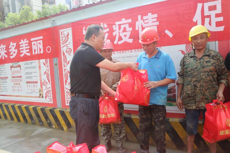 入夏以來,南昌旅游集團(tuán)積極開展“戰(zhàn)疫情、促文明、保安康”送清涼活動(dòng),7月28日上午,南旅集團(tuán)黨委書記、董事長(zhǎng)、總經(jīng)理李明,黨委副書記李虹虹,黨委委員、副總經(jīng)理陳皓等領(lǐng)導(dǎo),冒著高溫,來到我市重點(diǎn)工程“繩金塔民俗風(fēng)情街”項(xiàng)目,送上綠豆、蓮子等愛心禮包,向戰(zhàn)斗在一線建設(shè)的干部職工表示慰問。李明在聽完工程建設(shè)情況匯報(bào)后,仔細(xì)詢問了現(xiàn)場(chǎng)工人工作、生活狀況,叮囑項(xiàng)目部要一手抓好工程建設(shè),一手抓好防疫防暑,切實(shí)關(guān)心工人身心健康,確保職工安全生產(chǎn),文明施工,為我市創(chuàng)建健康、文明城市作貢獻(xiàn)。公司黨委書記、總經(jīng)理龔戩等班子成員全程陪同。